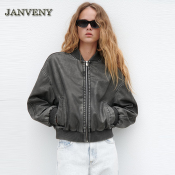 JANVENY-Chaqueta de Piel Sintética para Mujer, Abrigo Recortado de Cuero Pu Lavado con Cremallera y Fajas de Corbata, Retro, Primavera y Otoño, 2024